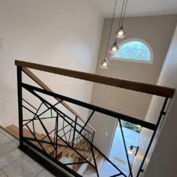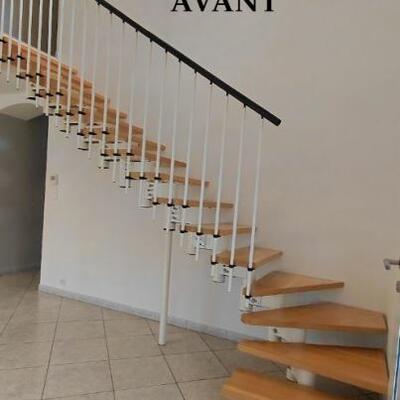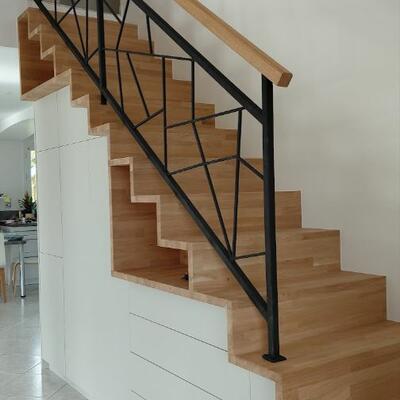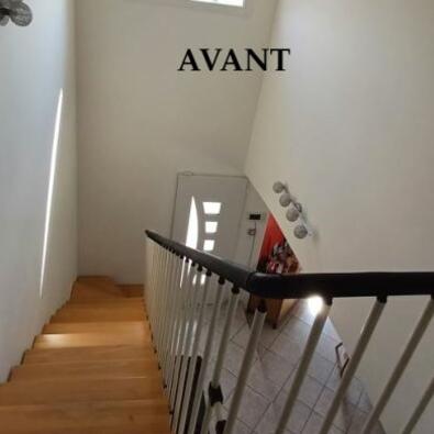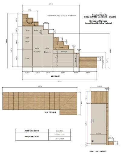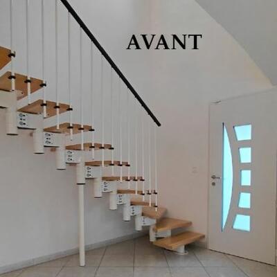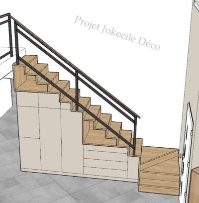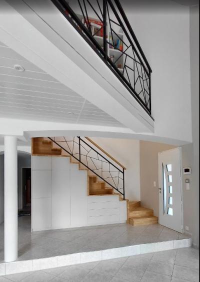 Optimisation de l'espace : Les meubles sur mesure permettent d'exploiter le potentiel d'une surface et répondre à des besoins spécifiques, Ici l'entrée avec la conception d'un escalier incluant des modules de rangements, conçu spécifiquement pour la fonctionnalité et l'esthétique de la pièce.